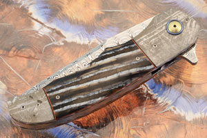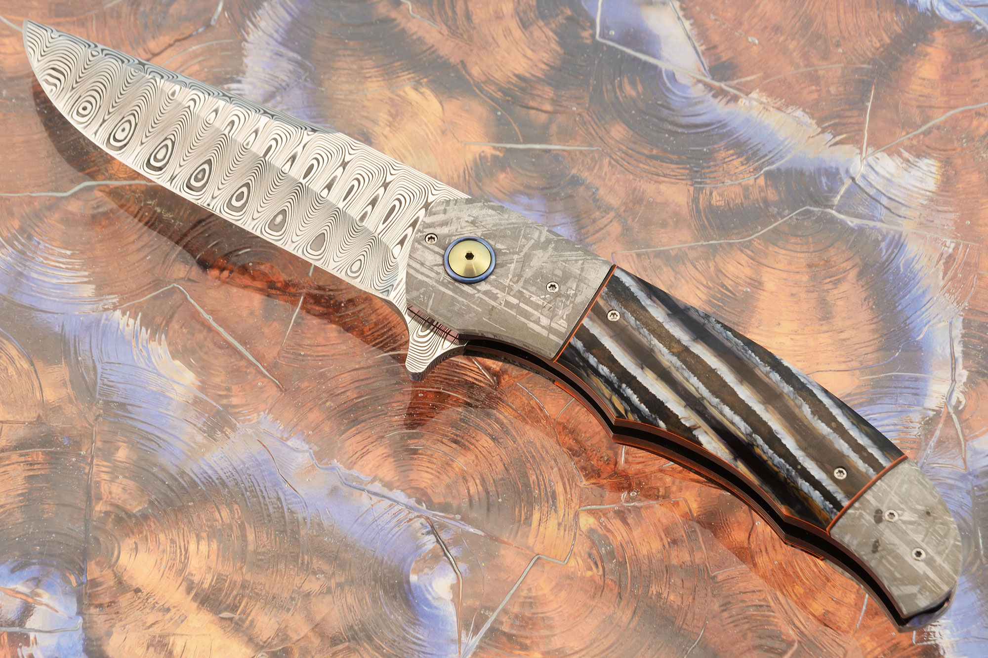 Ancient woolly mammoth tooth scales incorporate brown and caramel tones. A stunning handle! The stainless damascus pocket clip is mounted for right-side, tip-up carry. Titanium liners are anodized and hand fileworked. The liners surround a damascus backbar.