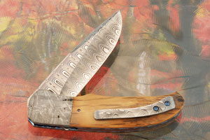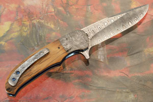 The hollow ground blade is grosse rosen pattern damascus forged by Damasteel in Sweden. The blade has smooth, drop shut action and is easily opened with one hand using the ambidextrous flipper toggle. It uses the IKBS (Ikoma Korth Bearing System) pivot system. This mechanism, which was originally designed to fit balisong knives, uses ball bearings to create exceptional action with no blade play. This special folder is made with ceramic ball bearings. Generally IKBS bearings are made either from tool steel or from stainless steel. Stainless steel can wear away, resulting in uneven action over time. Tool steel bearings can oxidize making the action rough. Ceramic bearings are the best of all worlds -- extremely hard and wear resistant, they are also inert and will not oxidize.