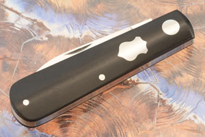 The handle is black Richlite. A polished stainless steel shield is inlaid into the left scale. The inlay is flawless with absolutely no gaps.