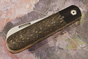 Handle scales are Gold Snakeskin FatCarbon. They are dovetailed to black G10 bolsters, ensuring a perfect fit. Titanium liners keep the knife light and fast.