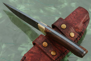 Deeply etched mokume gane bolsters combine brass and copper into a damascene that nicely complements the warm tones of the ironwood scales. They are dovetailed to the handle scales for a perfect fit. By using torx screws, Hennie ensures the knife can be taken apart if future repairs are ever needed.