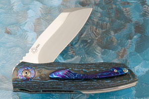 Handle scales are Arctic Storm FatCarbon set on anodized titanium liners. The pivot collar and pocket clip are heat colored Timascus titanium damascus. Jimping on the thumb ramp provides a comfortable, secure grip. The gently rounded handle feels sturdy and fills your hand perfectly. Anodized titanium liners surround a raised, polished backspacer. The titanium damascus pocket clip is mounted for right-side, tip-up carry.