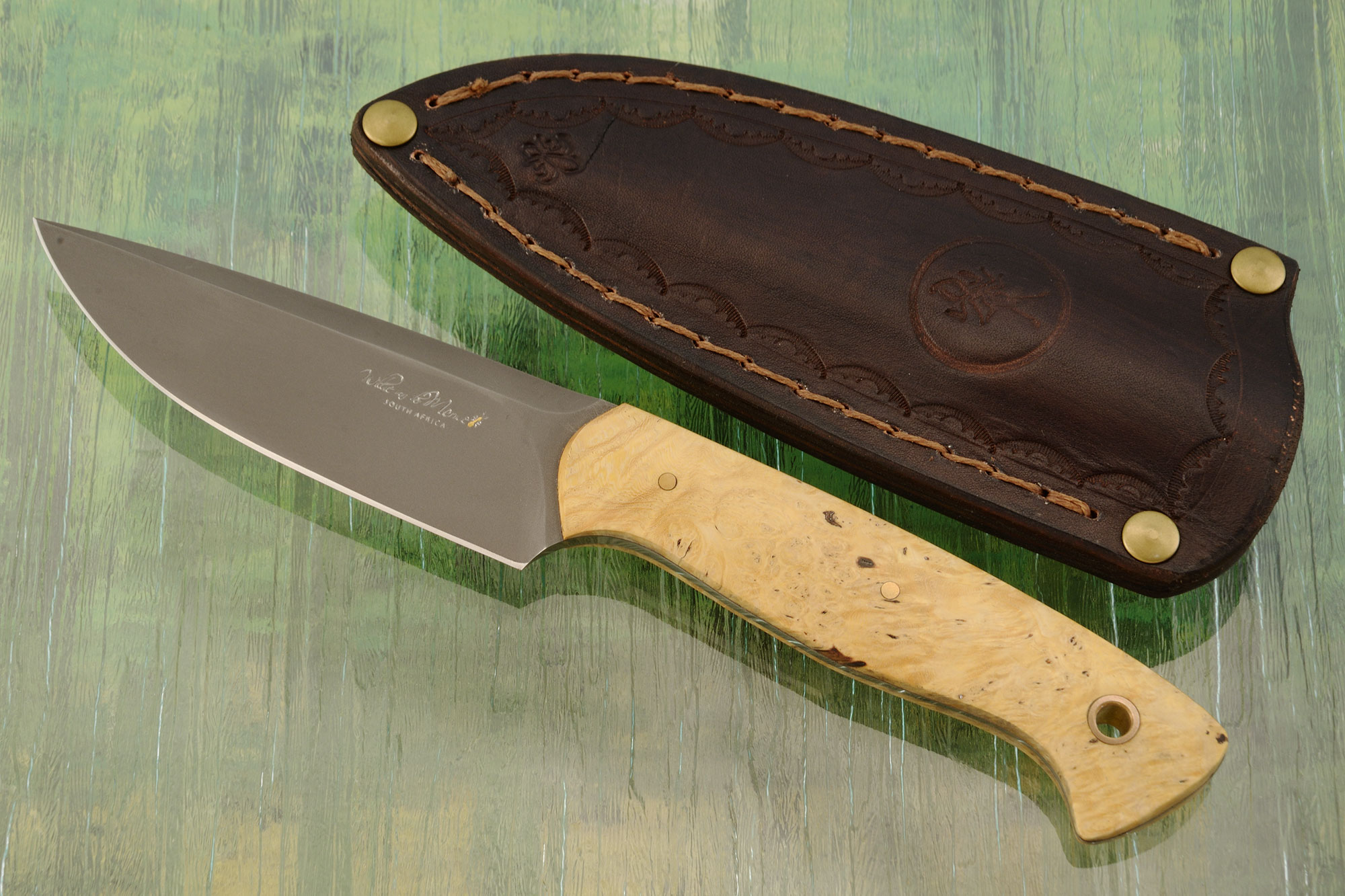 Hand contoured South African kiaat burl (Pterocarpus angolensis) handle scales are set on the distal tapered full tang, ensuring a perfect balance. A lanyard can easily be added to the back of the handle.