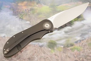 The frame is contoured and 3D textured blackened titanium. Turbo cut anodized titanium pivot collars add just the right amount of pop. A carbon fiber backspacer keeps the knife strong yet light. The ergonomic handle and jimping along the spine provide a solid, secure grip. The blackened 3D machined titanium pocket clip is mounted for right-side, tip-up carry.