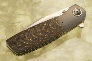 Handle scales are gold snakeskin FatCarbon. The bolsters are heat colored zirconium. Zirconium is a transitional metal that is primarily mined in South Africa and Australia. It is resistant to corrosion and scratching. Fileworked titanium liners are anodized and surround a carbon fiber backbar. The black titanium pocket clip is mounted for right-side, tip-up carry.