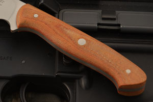 The hand contoured handle is tan Micarta secured to a full tang using three pins. The domed scales fill out your hand nicely and provide excellent grip. A large choil cutout in the handle prevents the hand from sliding over the blade.