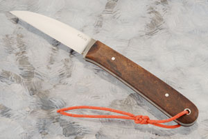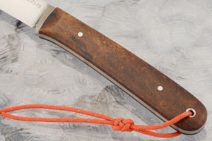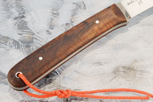 The handle is Arizona desert ironwood secured to a full tang using two pins. The compact handle fills your hand nicely and feels great. A lanyard provides easy extra retention.