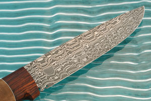 The handle is contoured hairy vitex burl (Vitex obovata). This African wood has a warm brown tone and a tremendous grain pattern reminiscent of thuya burl. The handle meets perfectly with warm toned cocobolo (Dalbergia retusa) bolsters.