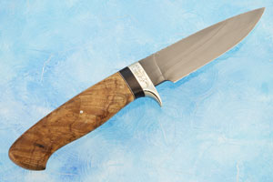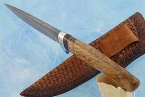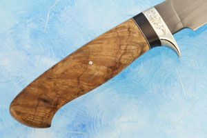 The handle is hairy vitex burl (Vitex obovata). This African wood has a warm brown tone and a tremendous grain pattern reminiscent of redwood burl and thuya burl. A red bushwillow (Corbretum apiculatum) spacer adds nice contrast. Thin fiber spacers assist the handle to adjust to temperature and humidity changes. The nickel silver guard is meticulously engraved with Kevin's vine scrollwork.