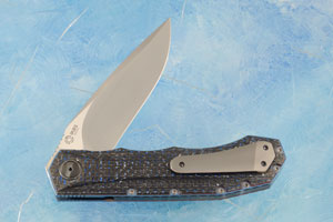 3D machined blue/silver carbon fiber handle scales are set on fileworked and anodized titanium liners. Jimping on the thumb ramp aids grip. The flipper doubles as a front guard that keeps your hand from sliding forward onto the blade. The gently rounded handle feels sturdy and fills the hand perfectly. The custom pivot and pivot collar heat colored zirconium. The 3D machined titanium pocket clip is mounted for right-side, tip-up carry and features a ceramic ball for excellent pocket retention.