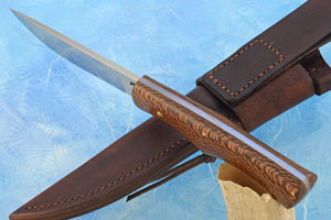 Stuart hand forged the drop point, recurve blade from 52100 carbon steel. This high performing steel is considered to be among the best steels (if not the very best) by many knifemakers and knife users. Makers such as Mastersmiths Bill Burke, Bob Kramer, and Ed Fowler have pioneered this long edge holding steel. It features an heirloom quality hand rubbed satin finish.