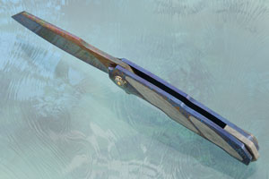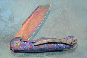 The titanium damascus handle is heat colored for a dramatic appearance. A sturdy framelock provides a strong lockup. Gibeon meteorite inlays are set into the left scale. The Gibeon meteorite landed in Great Namaqualand, Namibia, Africa. It radio carbon dates to over 4 billion years ago. Gibeon fragments are spread over one of the largest strewn fields in the world, measuring 70 miles wide by 230 miles long and have a distinctive pattern known as the Widmanstatten pattern, which is one of the richest and most distinct patterns found in meteorites. The crystalline patterns can only form in the vacuum of space. The large metallic crystals require millions of years of cooling to form from a molten planetary core fragment. It has been estimated that it took about 1000 years for these molten pieces of planetary core to cool by just 1 degree Celsius!