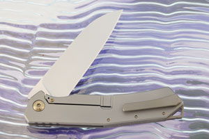 The blade runs on Trevor's in-house-made double row caged ceramic ball bearings and has silky-smooth action. Generally bearings are made either from tool steel or from stainless steel. Stainless steel can wear away, resulting in uneven action over time. Tool steel bearings can oxidize making the action rough. Ceramic bearings are the best of all worlds. Extremely hard and wear resistant, they are also inert and will not oxidize. The blade is easily opened single-handed using the flipper tab.