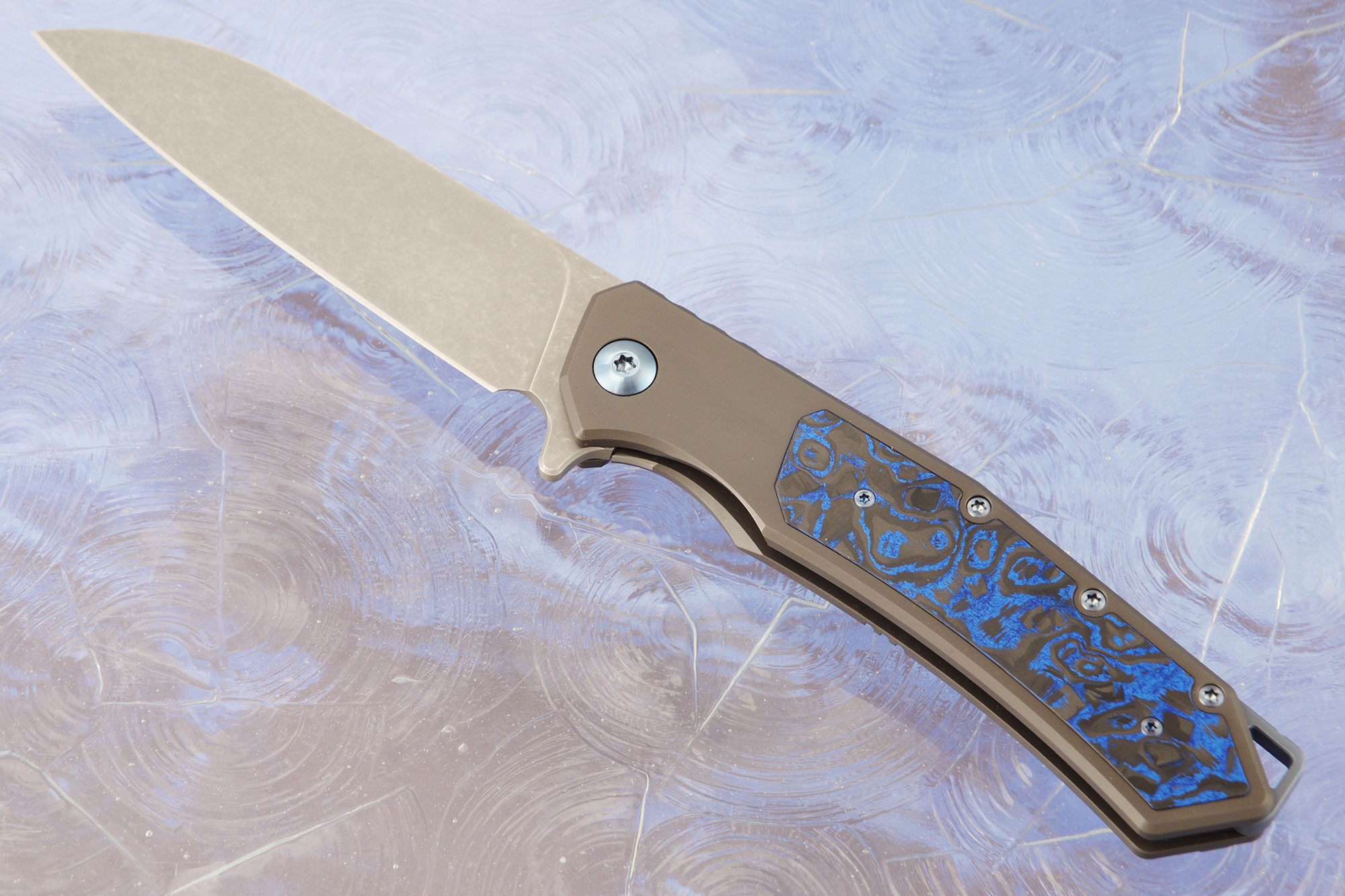 The handle is bead blasted grade 5 titanium with a blue/black Carbon Plate inlaid into each side. The lock side acts as an elegant over-travel stop. The frame lock comes with a hardened steel lock face for smooth operation and solid lockup. The titanium has been skeletonized to reduce weight to only 3.6 oz! A lanyard can be added using the lanyard hole included in the backbar. The 3D machined titanium pocket clip is mounted for right-side, tip-up carry.
