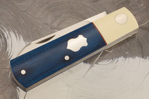 The handle is crosscut blue Micarta. Rare antique Westinghouse Micarta bolsters are perfectly fit to the scales. This Micarta was developed in 1910 by Westinghouse Electric Corporation as an industrial thermo-set laminate for electrical insulation. This light toned Micarta was lost in a warehouse and only recently discovered. The top shows the beautiful yellowing with age that makes this Micarta so captivating. An inlaid escutcheon is also formed from stainless steel. The inlay is flawless with absolutely no gaps.