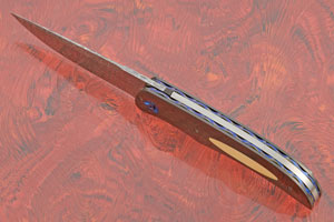 The hollow ground blade is ladder pattern damascus forged by Damasteel in Sweden. The blade has smooth, drop-shut action and is easily opened with one hand using the ambidextrous front flipper toggle. It uses the IKBS (Ikoma Korth Bearing System) pivot system. This mechanism, which was originally designed to fit balisong knives, uses ball bearings to create exceptional action with no blade play. This special folder is mad`e with ceramic ball bearings. Generally IKBS bearings are made either from tool steel or from stainless steel. Stainless steel can wear away, resulting in uneven action over time. Tool steel bearings can oxidize making the action rough. Ceramic bearings are the best of all worlds -- extremely hard and wear resistant, they are also inert and will not oxidize.