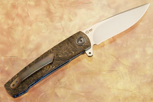 Gold Dark Matter FatCarbon handle scales are set on anodized titanium liners, providing an elegant contrast. The custom heat colored zirconium pivot is surrounded by a matching pivot collar. Titanium liners surround a carbon fiber backbar, inlaid with MoonGlow II (luminescent polyester). This inlay glows in the dark, making the knife easy to find even under dark conditions. The handle is completed with an anodized titanium pocket clip mounted for right-side, tip-up carry.