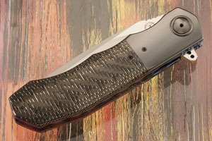 Handle scales are nickel wire carbon fiber. Jimping on the thumb ramp provides a comfortable, secure grip. The gently rounded handle feels sturdy and fills your hand perfectly, yet this Compact L44 Flipper is more pocket-friendly. Heat colored zirconium bolsters provide a dramatic contrast. Zirconium is a transitional metal that is primarily mined in South Africa and Australia. It is resistant to corrosion and scuffing. The custom zirconium pivot is surrounded by a zirconium pivot collar. Fileworked titanium liners are anodized and surround a black G-10 backspacer. The 3D machined titanium pocket clip with ceramic retention ball is mounted for right-side, tip-up carry.