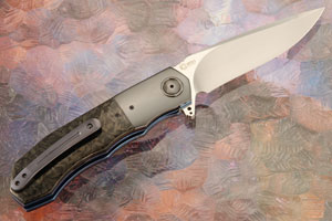Handle scales are shred carbon fiber. Jimping on the thumb ramp provides a comfortable, secure grip. The gently rounded handle feels sturdy and fills your hand perfectly. Heat colored zirconium bolsters provide an elegant accent. Zirconium is a transitional metal that is primarily mined in South Africa and Australia. It is resistant to corrosion and scuffing. The custom zirconium pivot is surrounded by a zirconium pivot collar. Fileworked titanium liners are anodized and surround a black G-10 backbar. The 3D machined titanium pocket clip with ceramic retention ball is mounted for right-side, tip-up carry.
