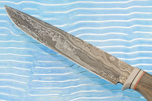 The damascus for this blade was forged by Willie Kilian, combining SK5 carbon steel and nickel. The 7 inch length is perfect for a variety of tasks around the camp site. From chopping up kindling to preparing dinner at the camp site, this utility knife has you covered! Because this knife is made from carbon steel, we recommend using camellia oil to oil the blade and natural wood handle.