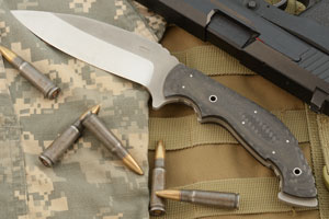 Carbon fiber handle scales are set on the full tang for strength and durability. The end of the tang is filed for traction in an ice pick grip. The gently rounded handle fills your hand nicely and provides a comfortable grip.