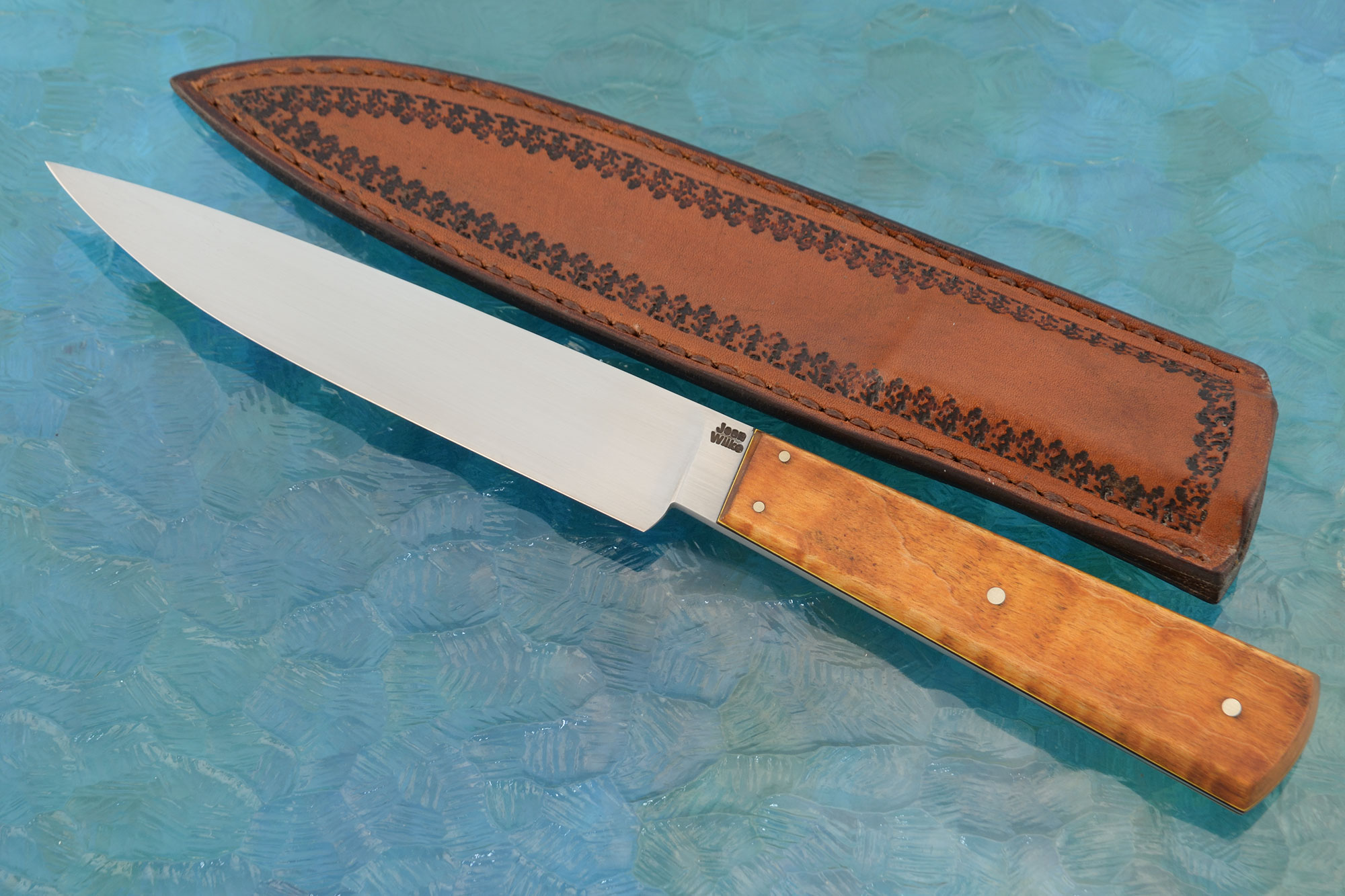 The knife is accompanied by a hand stitched, custom leather sheath.