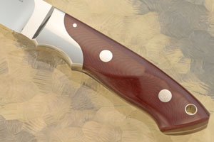 Maroon Micarta handle scales are set on the distal tapered full tang for strength and durability. The handle is perfectly contoured for a secure, comfortable grip that you won't want to put down. It is completed with two hidden bolt rivets and a steel lined lanyard hole. The 304 stainless steel guard meets with the handle scales in an elegant, perfectly performed S-curve.