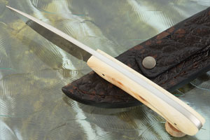 The blade on this small drop point utility is hand ground Bohler N690 and features a satin finish. N690 takes an incredibly sharp edge and holds onto it. Increased toughness gives it better resistance to edge chipping. The spine has been rounded for a comfortable grip.