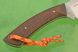 The handle is presentation grade ringed gidgee (Acacia cambagei). Gidgee is an exceptional wood for knife handles and is considered to be one of Australia's most beautiful timbers. It has tremendous stability even when exposed to fluctuations in humidity and temperature. It is among the densest woods in the world and has a beautiful curl similar to Hawaiian koa. The contoured handle is extremely comfortable and accommodates multiple grips for a wide variety of skinning tasks. A bright paracord lanyard is included to make the knife easy to spot if dropped while out in the field.