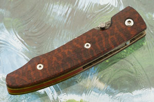 Presentation grade snakewood (Brosimum guianense) handle scales are set on anodized titanium liners. This dramatic South American wood combines medium and dark toned striations into a dramatic pattern reminiscent to snakeskin. Titanium liners surround a maroon Micarta backspacer. At just 2.2 oz, it will be easy to keep this knife in your pocket - unnoticed until it is needed.
