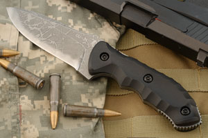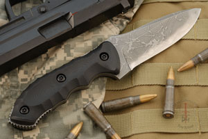 Black G-10 handle scales are hand contoured for a secure, comfortable grip. Jimping on the back of the handle provides excellent traction while holding the knife in an ice pick grip.