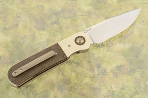 The handle combines OD green Micarta with Ivory G-10 bolsters. The combination of materials is particularly dramatic. A matching OD green pivot collar surrounds the anodized titanium pivot. Bronze anodized titanium liners surround a matching Ivory G-10 backbar. An anodized, orange peel textured titanium pocket clip is mounted for right-side, tip-up carry.
