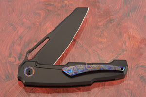 The 6Al-4V titanium handle features a matching blacked out Cerakote finish. The sturdy framelock provides a strong lockup. The pivot collar, backspacer, inlays, and pocket clip are made from matching heat colored Black Timascus zirconium/titanium damascus. The pocket clip is mounted for right-side, tip-up carry.