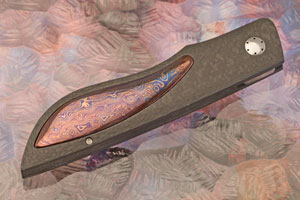 Handle scales are carbon fiber. A nested sidelock and carbon fiber backbar keep the knife incredibly lightweight at just 2.6 ounces! The contoured scales fill your hand nicely and provide a comfortable grip. Heat colored damascus, forged from carbon steels, is inlaid into both sides of the handle. The left side inlay acts as a hidden pocket clip. When the top of the clip is pressed, the clip pivots outward and will clip comfortably into a pocket.