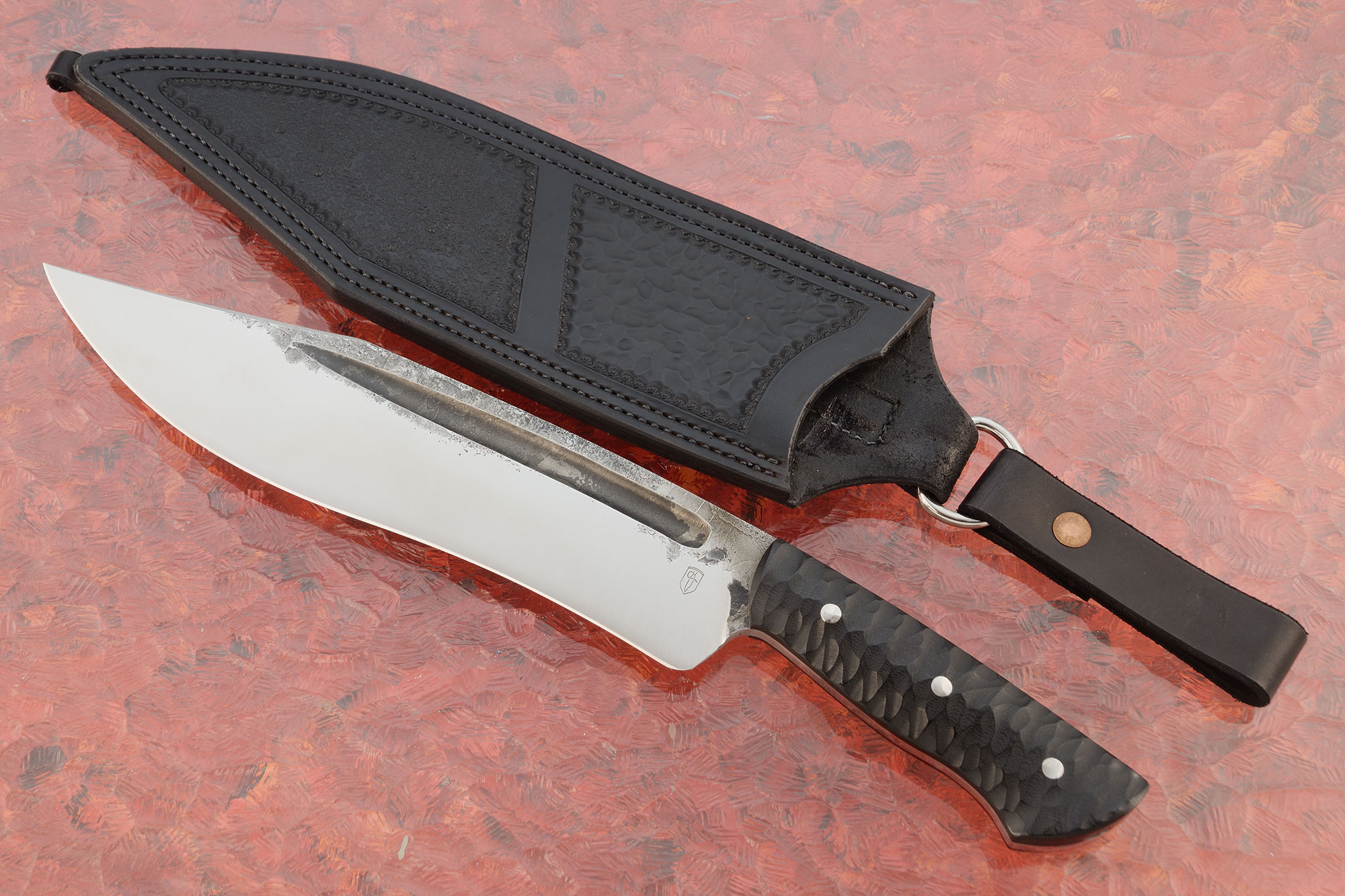 The blade on this big chopper is hand forged 80CrV2 carbon steel. 80CrV2 carbon steel holds an exceptional edge and maintains high chip resistant, making it perfect for hard use knives. A fuller runs along both sides of the blade. The top is forge textured. The grinds are satin finished. We recommend using camellia oil to avoid rust and oxidation. Cody's mark is on the left side of the blade.