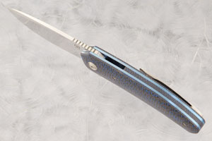 Handle scales are blue lightning strike carbon fiber. Blue anodized titanium liners surround a matching lightning strike carbon fiber backbar. The 3D machined Damasteel stainless damascus pocket clip is mounted for right-side, tip-up carry.