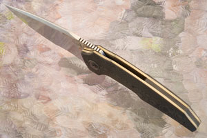 Handle scales are Chatoyant carbon fiber. The custom pivot is heat colored zirconium and is surrounded by a matching heat colored zirconium pivot collar. Jimping on the thumb ramp aids grip. The gently rounded handle feels sturdy and fills the hand perfectly. Blue anodized titanium liners surround a carbon fiber backbar. The 3D machined zirconium pocket clip is mounted for right-side, tip-up carry.