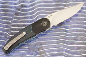 Handle scales are black G10 and feature Arctic Storm FatCarbon inlays meticulously set into both sides of the knife. Jimping on the thumb ramp aids grip. The gently rounded handle feels sturdy and fills your hand perfectly. The custom pivot and collar are heat colored zirconium. The handle is completed with blue anodized titanium liners surrounding a carbon fiber backbar. The ultra-light titanium pocket clip is mounted for tip-up, right-side carry.