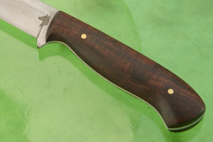 The handle is hand contoured ringed gidgee (Acacia cambagei). Gidgee is an exceptional wood for knife handles and is considered to be one of Australia's most beautiful timbers. It has tremendous stability even when exposed to fluctuations in humidity and temperature. It is among the densest woods in the world and has a beautiful curl similar to Hawaiian koa.