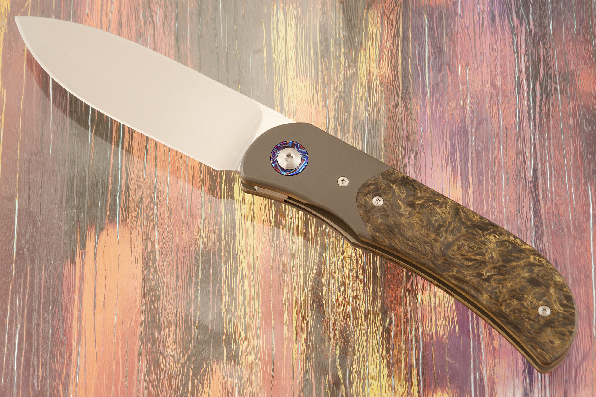 Gold Dark Matter FatCarbon scales are set on bronze anodized titanium liners. The scales meet perfectly with dark titanium bolsters in a complex curve. Timascus titanium damascus pivot collars surround the titanium pivot. The Timascus pocket clip is mounted for right-side, tip-up carry. Excellent work throughout!