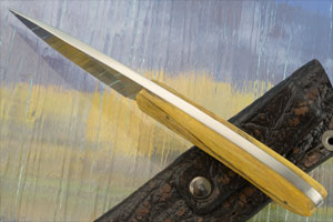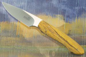 This small drop point utility is hand ground Bohler N690 stainless steel. N690 takes an incredibly sharp edge and holds onto it. Increased toughness gives it better resistance to edge chipping. The blade has been hollow ground to a high-performance edge.