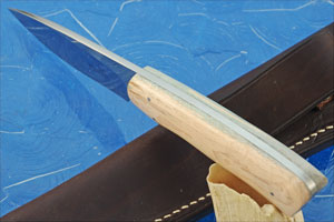 Handle scales are teal dyed maple set on the full tang with stainless steel pins. The contoured handle is extremely comfortable and provides an excellent grip.