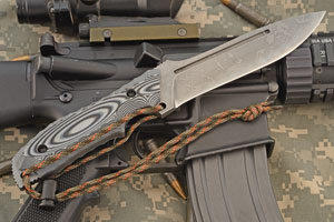 Handle scales are black/grey G-10. They are carved for traction and comfort while carrying or using. Aggressive jimping on the spine and back of the knife provide excellent traction in a variety of grips. The paracord lanyard setup provides extra security in hand.