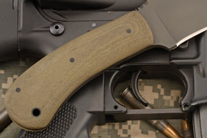 This knife is very similar to the standard issue model Daniel Winkler is currently providing to active duty operators within the Naval Special Warfare Unit. The blade is formed from 3/16" 80CrV2 carbon steel with a non-glare Caswell black oxide finish. A tapered full tang means great balance. A slip-resistant green laminate handle is set on the full tang.