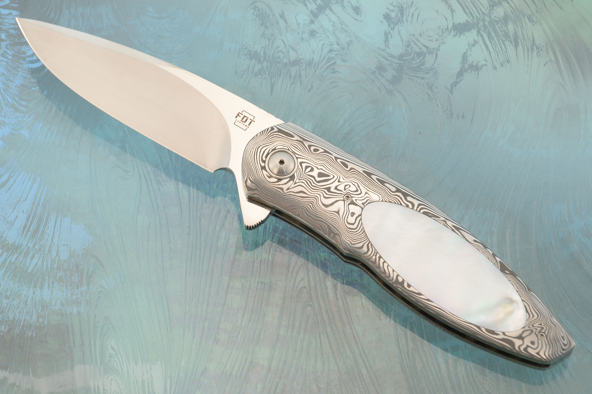 Damasteel handle scales are set on bronze anodized titanium liners. Whitelip mother of pearl is inlaid into both sides of the handle. The pivot is surrounded by a domed stainless pivot collar. The liners surround a White Storm FatCarbon backbar. The handle fills your hand nicely.