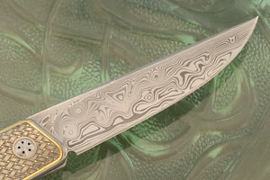 The blade on this Large Ball Release Gent's Front Flipper is hand ground stainless damascus forged by Damasteel in Sweden. The high contrast steel is both dramatic and extremely high performing. The indent and release balls are silicon nitride (Hrc 93!). Des' craftsmanship means that this locking mechanism works smoothly and comfortably. The front flipper opener is easy to use -- it is designed for easy single handed opening and closing. The blade is perfectly centered.