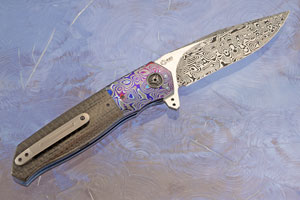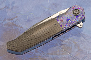 Handle scales are carbon fiber. Jimping on the thumb ramp provides a comfortable, secure grip. The gently rounded handle feels sturdy and fills your hand perfectly. Black Timascus bolsters meet perfectly to the scales. A zirconium pivot collar surrounds the external zirconium custom pivot. Zirconium is a transitional metal that is primarily mined in South Africa and Australia. It is resistant to corrosion and scuffing. Titanium liners are fileworked and anodized. The 3D machined titanium pocket clip with ceramic retention ball is mounted for right-side, tip-up carry.