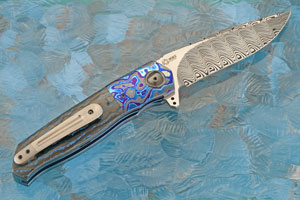 Handle scales are Arctic Storm FatCarbon. Jimping on the thumb ramp provides a comfortable, secure grip. The gently rounded handle feels sturdy and fills your hand perfectly. Black Timascus bolsters meet perfectly to the scales. A zirconium pivot collar surrounds the external zirconium custom pivot. Zirconium is a transitional metal that is primarily mined in South Africa and Australia. It is resistant to corrosion and scuffing. Titanium liners are fileworked and anodized. The 3D machined titanium pocket clip with ceramic retention ball is mounted for right-side, tip-up carry.