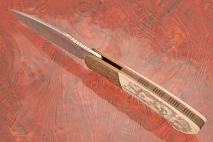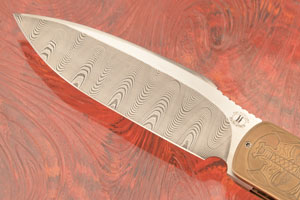 The drop point blade is hand ground Zladinox stainless damascus. The ladder pattern is tightly controlled and will have an exceptional edge. The blade is hollow ground for an easy to maintain edge. It is perfectly centered. Ceramic bearings ensure it has silky-smooth, drop shut action. The inobtrusive front flipper is tremendously easy to use.