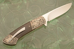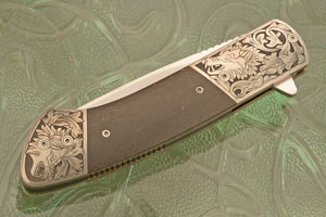 Handle scales are Copper Brain Coral FatCarbon, set on anodized titanium liners. Titanium bolsters are hand engraved - combining images of wolves with floral scroll by Ida Mostert. The engraving is beautifully done. A black G-10 backspacer keeps the knife light, yet strong. A 3D machined pocket clip is mounted for right-side, tip-up carry.